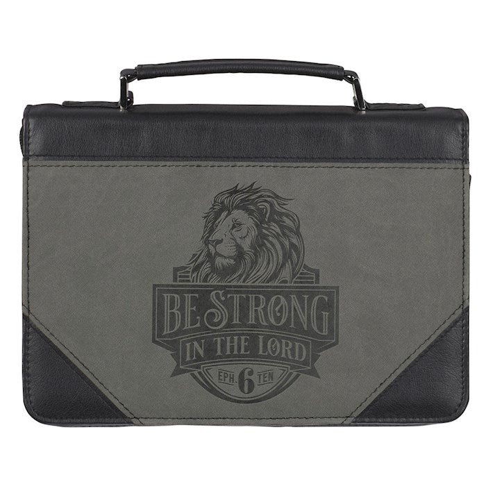 Be Strong In The Lord (Ephesians 6:10)-Black/Gray Lion Faux Leather Classic Bible Cover-XLarge is backordered and will ship as soon as it is back in stock.