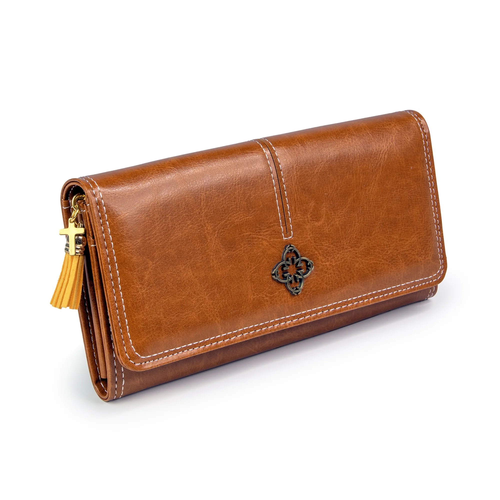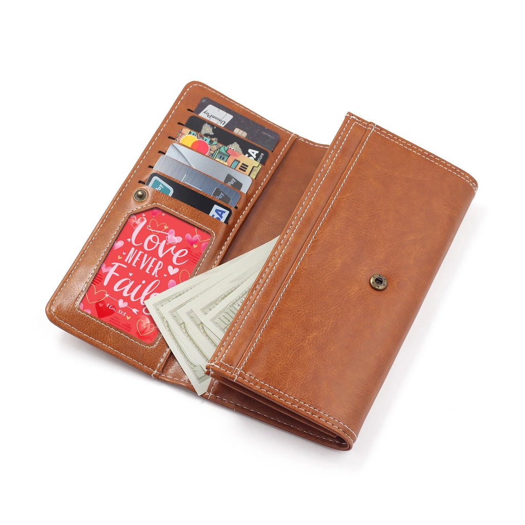 This compact, snap closure, clutch wallet features three spacious bill slips, a zip coin pocket, eight card slips, and an ID window. It is adorned with contrast stitching and a decorative cross emblem. Includes a Scripture Prayer Card (designs vary).