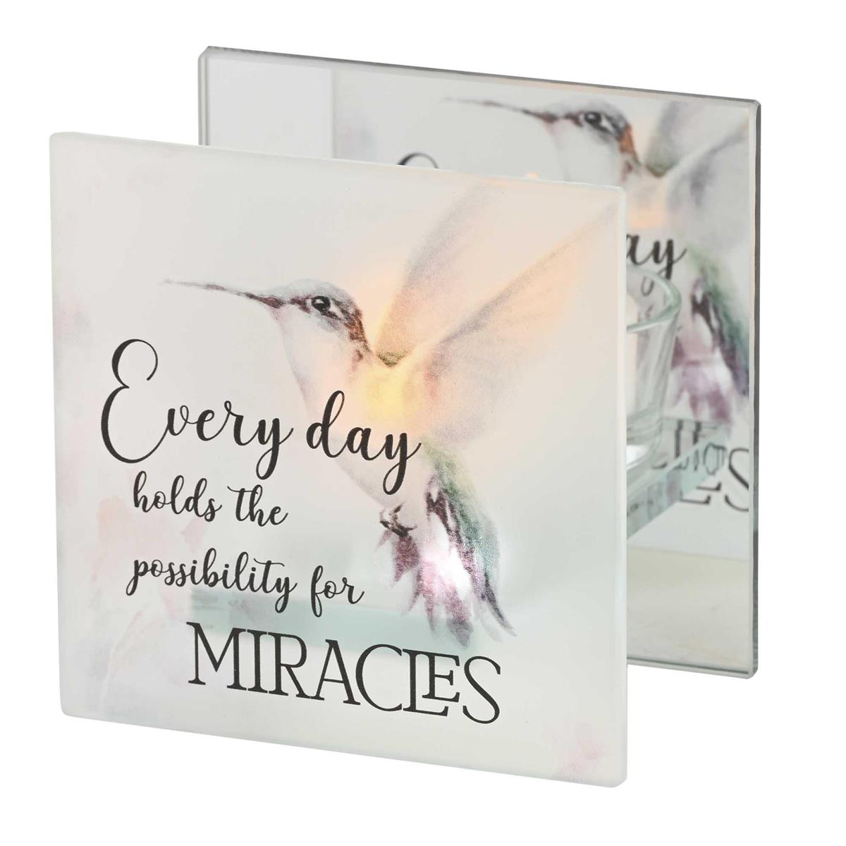Sheer Tealight Holder Radiates A Glow Of Inspiration. Glass Squares Are Frosted Outside, Mirrored Inside To Enhance The Soft Light Shining From The Included LED Tealight On Center Shelf. Front Glass Square Is Decorated With A Warm And Meaningful Sentiment. Size Is 4 Wide x 4 High x 2.4 Deep. Sentiment Accompanied By A Hummingbird: Every Day Holds The Possibility For Miracles.