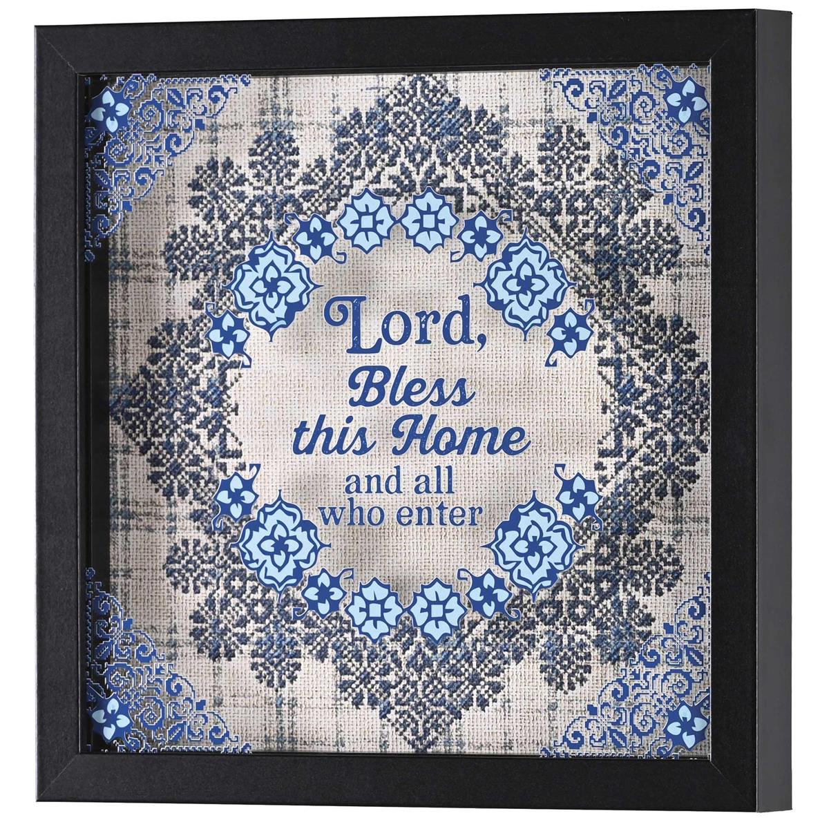 Shadow Box Style Framed Wall Decor Features A Cross-Stitch Style Floral Design Around Text: Lord, Bless This Home And All Who Enter. Parts Of The Design Are Printed Directly On The Glass, While The Rest Are On An Insert, Giving The Piece A Dimensional Look. Frame Is MDF Wood With Black Finish. Print/Glass Size Is 10 X 10; Outer Frame Size Is 11 X 11 X 1-1/4. Hanger On Back. Assembled In The US From Imported Materials. Comes Packed In A Brown Box.