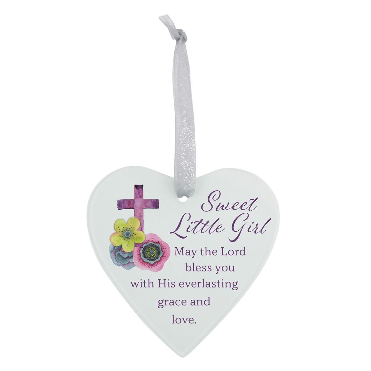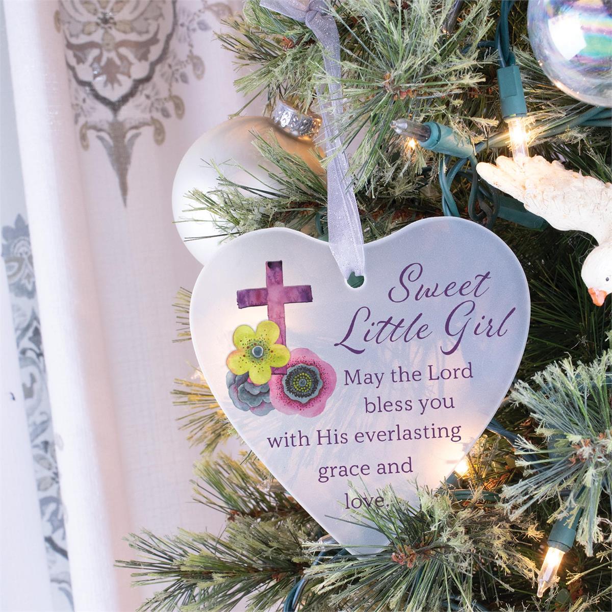 Sweet Little Girl - May The Lord Bless You With His Everlasting Grace And Love. Glass Heart Ornament Is Softly Frosted In White On The Back Side. Heart Is 4 1/2 x 4 1/2. Includes White Fabric Hanging Ribbon.