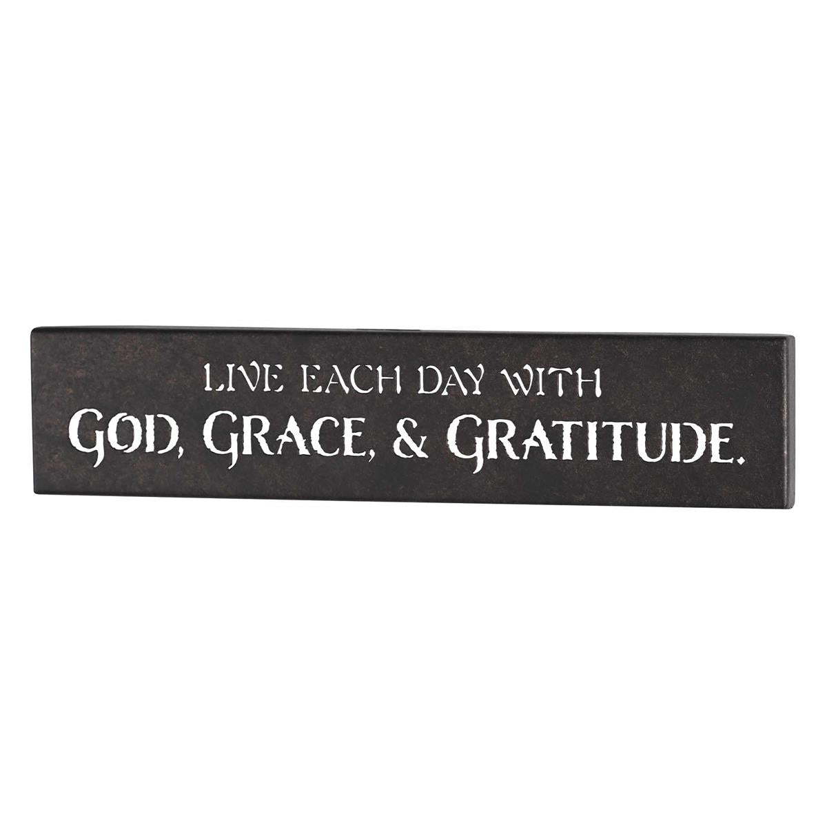 A Metal Wall Hanging Featuring Intricately Cut-Out Words That Read, Live Each Day With God, Grace, And Gratitude. This Piece Serves As An Excellent Accent Piece For Any Wall Display In Home Decor.