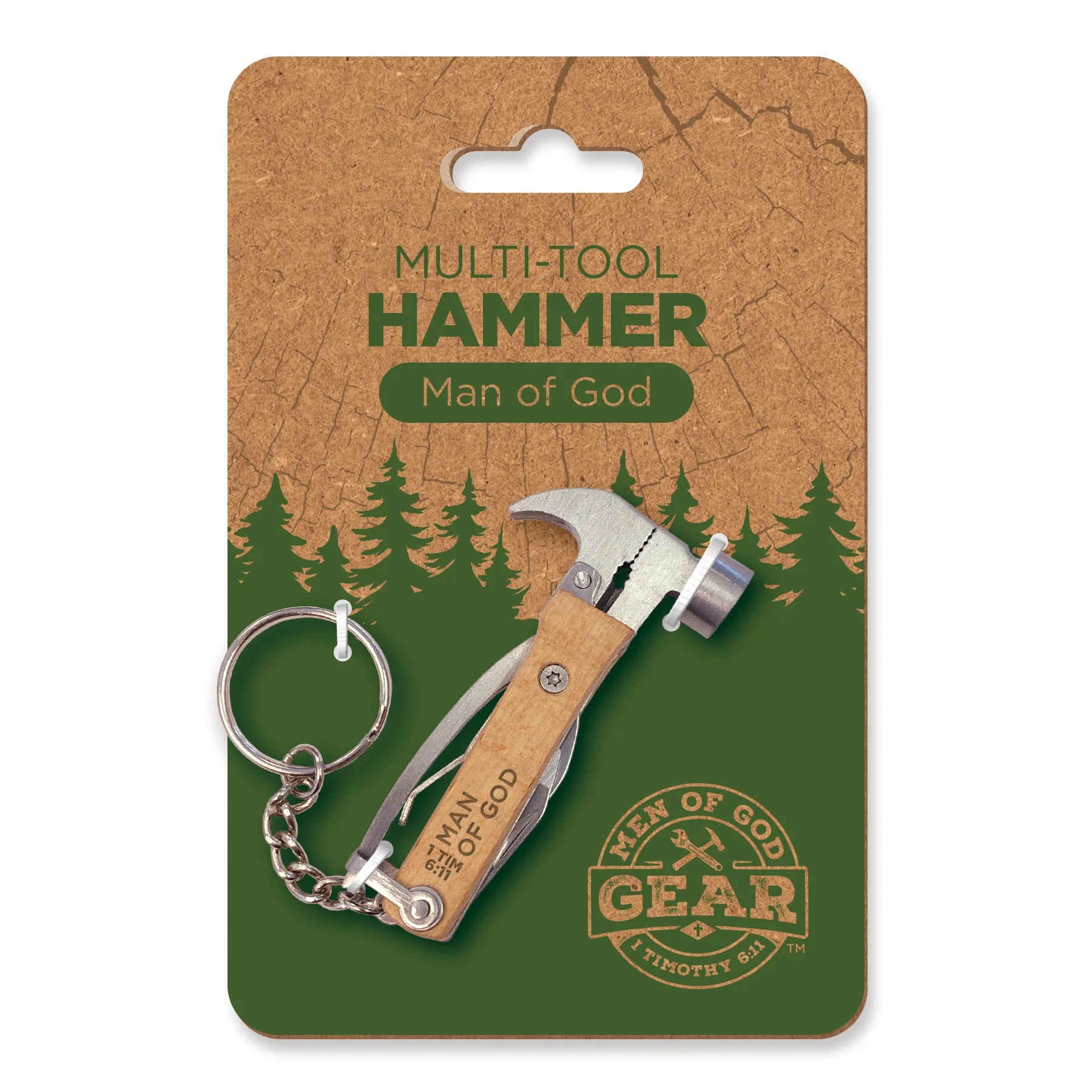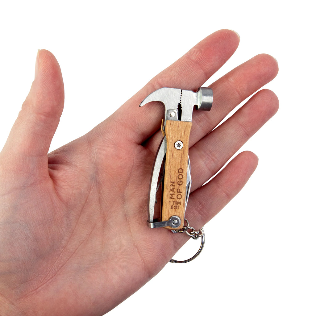 Each multi-tool includes a hammer, 1.0” blade, flathead screwdriver/bottle opener, pliers, nail pry, and keyring. The beechwood handle features a laser-engraved scripture, serving as a lasting reminder of faith.