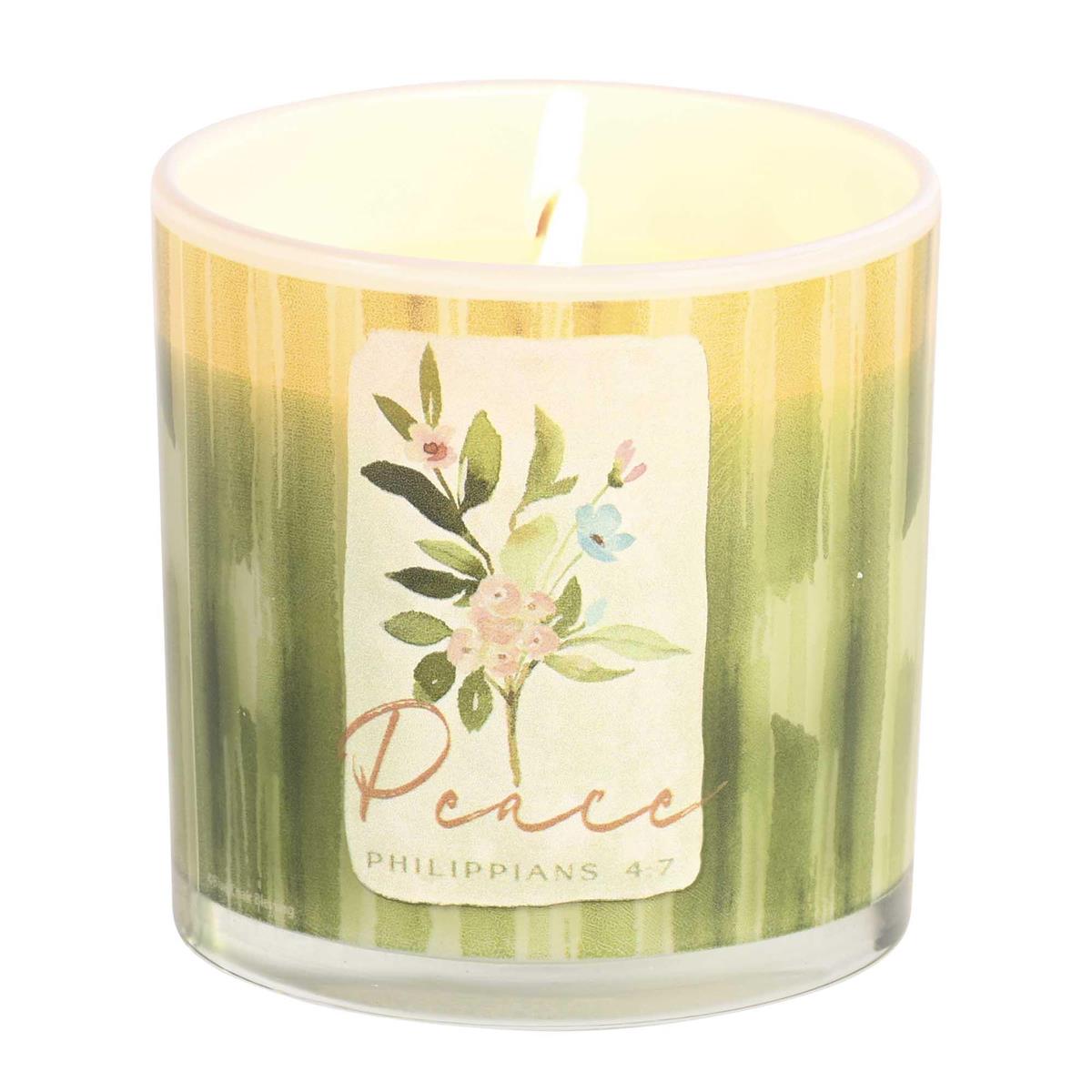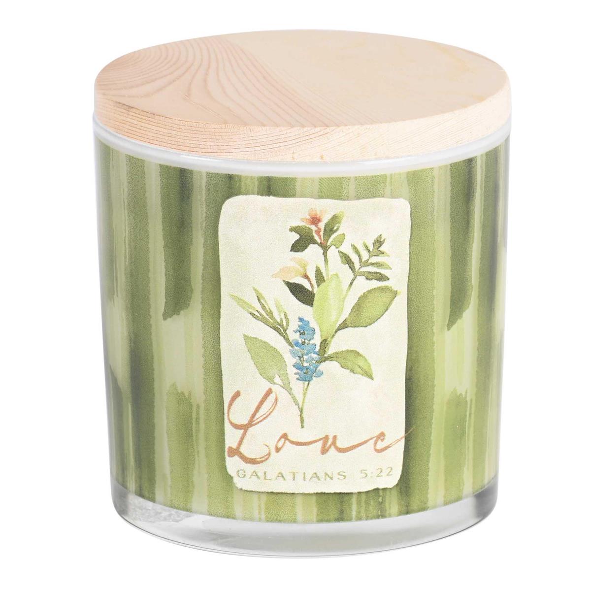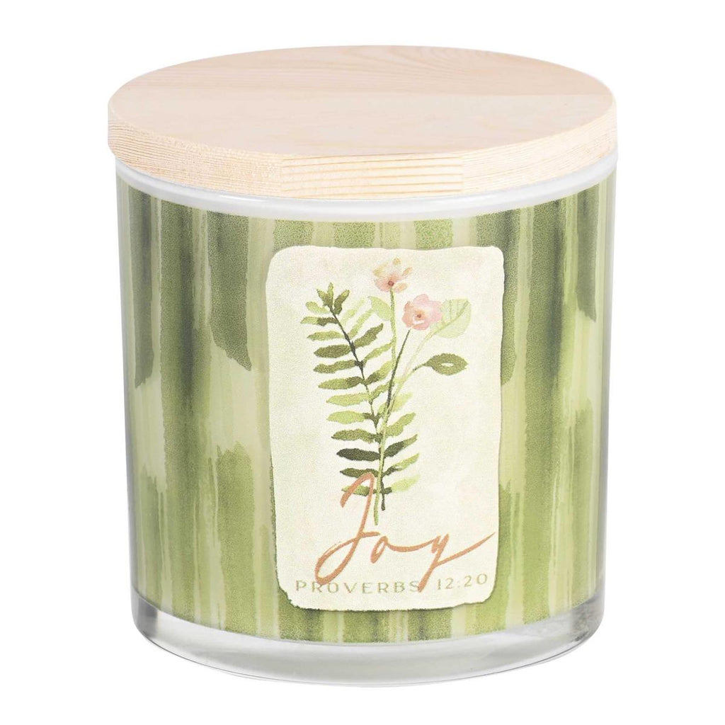 This Lidded Candle Features A Green Leaf Wrap-Around Background For 3 Floral Designs Around The Candleholder: Peace (Philippians 4:7); Love (Galatians 5:22) And Joy (Proverbs 12:20). Warm And Inviting, The Candle Is Lightly Scented With All Natural Soy Wax, Two Lead-Free Cotton Wicks, And Holds Approximately 50 Hours Of Burn Time. Soy Wax Is Non-Toxic And Cleaner-Burning Containing No Toxins, Carcinogens, Or Pollutants. Material: Soy Wax, Glass, Wood. Size: 13 Oz, 4In Diameter By 4 1/4 In High. Comes Packed In A White Or Brown Box.