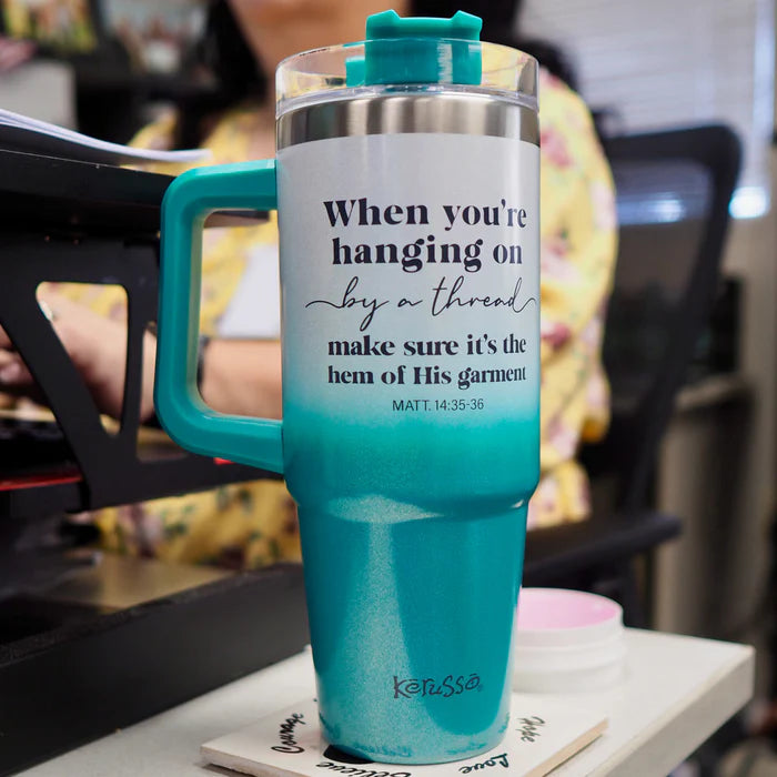 Hang onto hope with this cool ombre “Hemmed” 30 oz. Stainless-Steel Mug with Straw by Kerusso® in holographic Teal with a convenient swivel lid closure. You’ll stay hydrated at work, school, or in the great outdoors with this practical handled tumbler. When life feels like it’s unraveling, the faithful don’t give up…they look up, and give it to God!