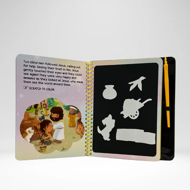 My Scratch Bible is a fun, hands-on Bible activity book for kids aged 4+. Each story is paired with a scratch-off activity that brings faith to life—revealing vibrant images or shiny metallic patterns hidden beneath black ink!