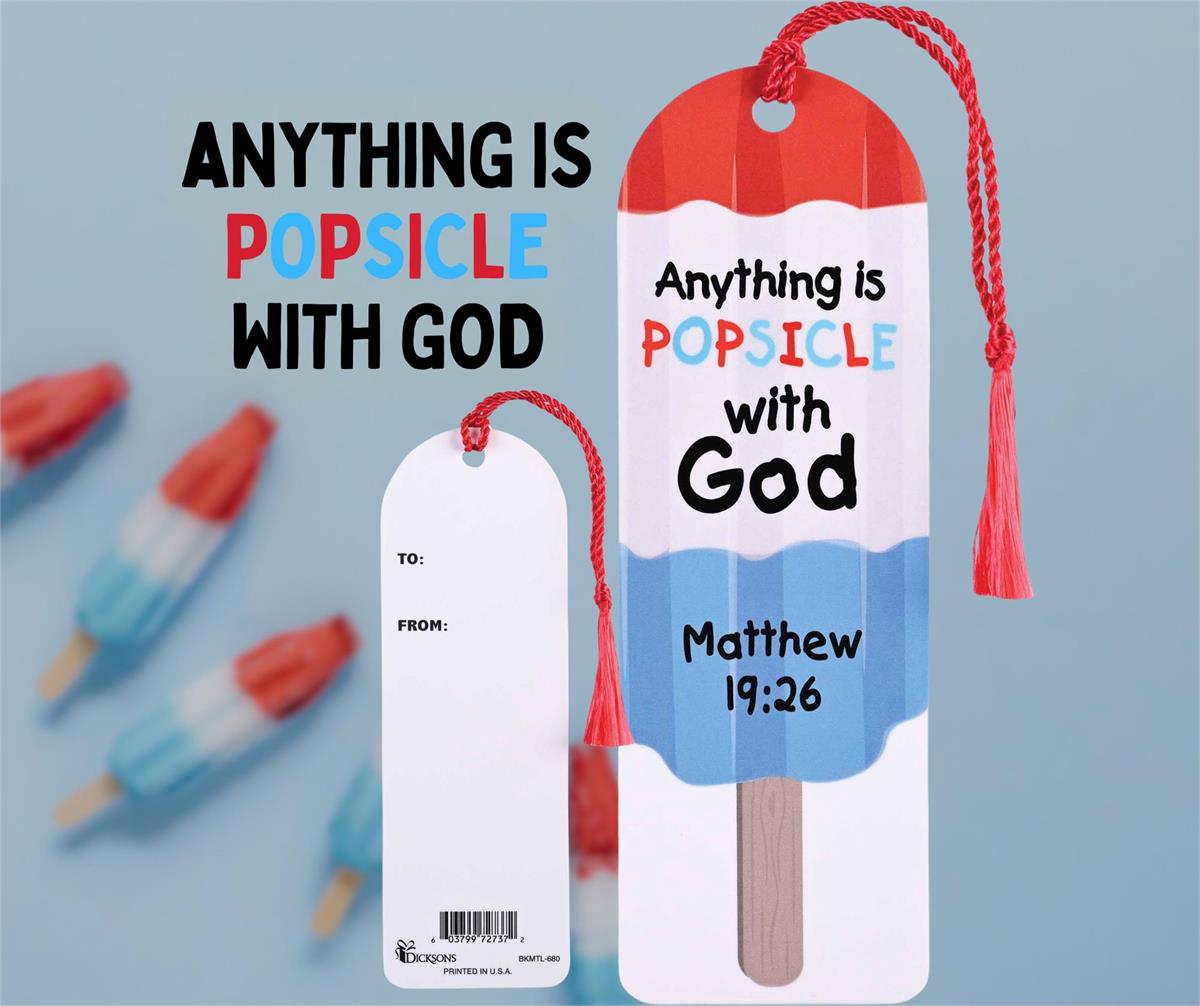 This Red-Tasseled Arched-Top Bookmark Features A Popsicle Design Overlaid With A Paraphrase Of Matthew 19:26: Anything Is Popsicle With God. The White Back Displays To And From Spaces For Personalization. Each Bookmark Measures 2 X 6 And Comes In A Pack Of 12 Pieces. Made In The USA. Packed In A Polybag.