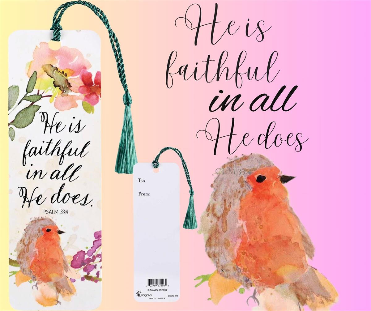 This Green-Tasseled Bookmark Features An Abstract Bird/Floral Design With Psalm 33:4: He Is Faithful In All He Does. The White Back Displays To And From Spaces For Personalization. Each Bookmark Measures 2 X 6 And Comes In A Pack Of 12 Pieces. Made In The USA. Copyright Amylee Weeks Courtesy Of MHS Licensing. Packed In A Polybag.