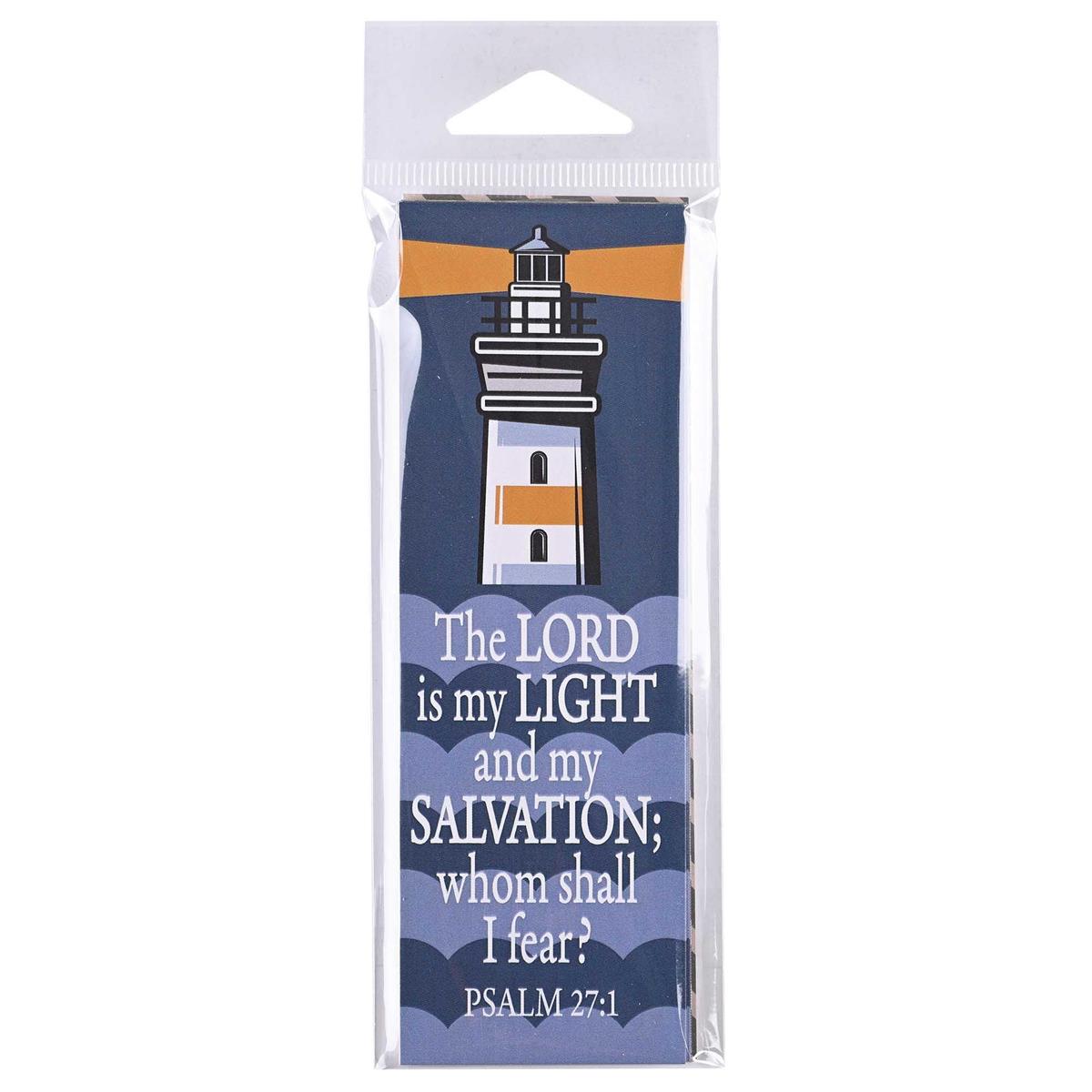 12 Bookmarks Per Pack (4 Each Of 3 Designs) - 1-3/4 X 5-1/4 H. The 3 Designs On These Bookmarks Feature A Lighthouse Theme With Scripture (Psalm 27:1, Hebrews 6:19, And John 8:12). Printed In USA. Packed In A Polybag. This Piece Has A Distressed Finish.