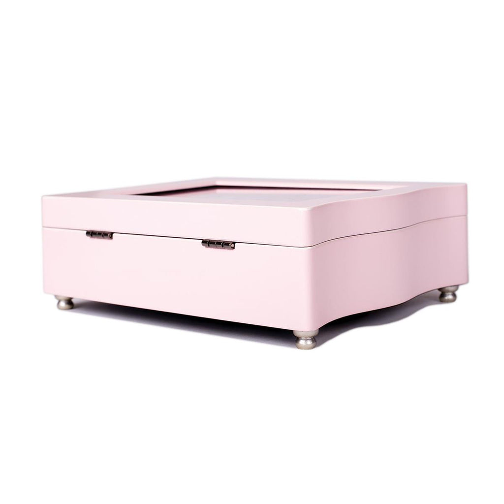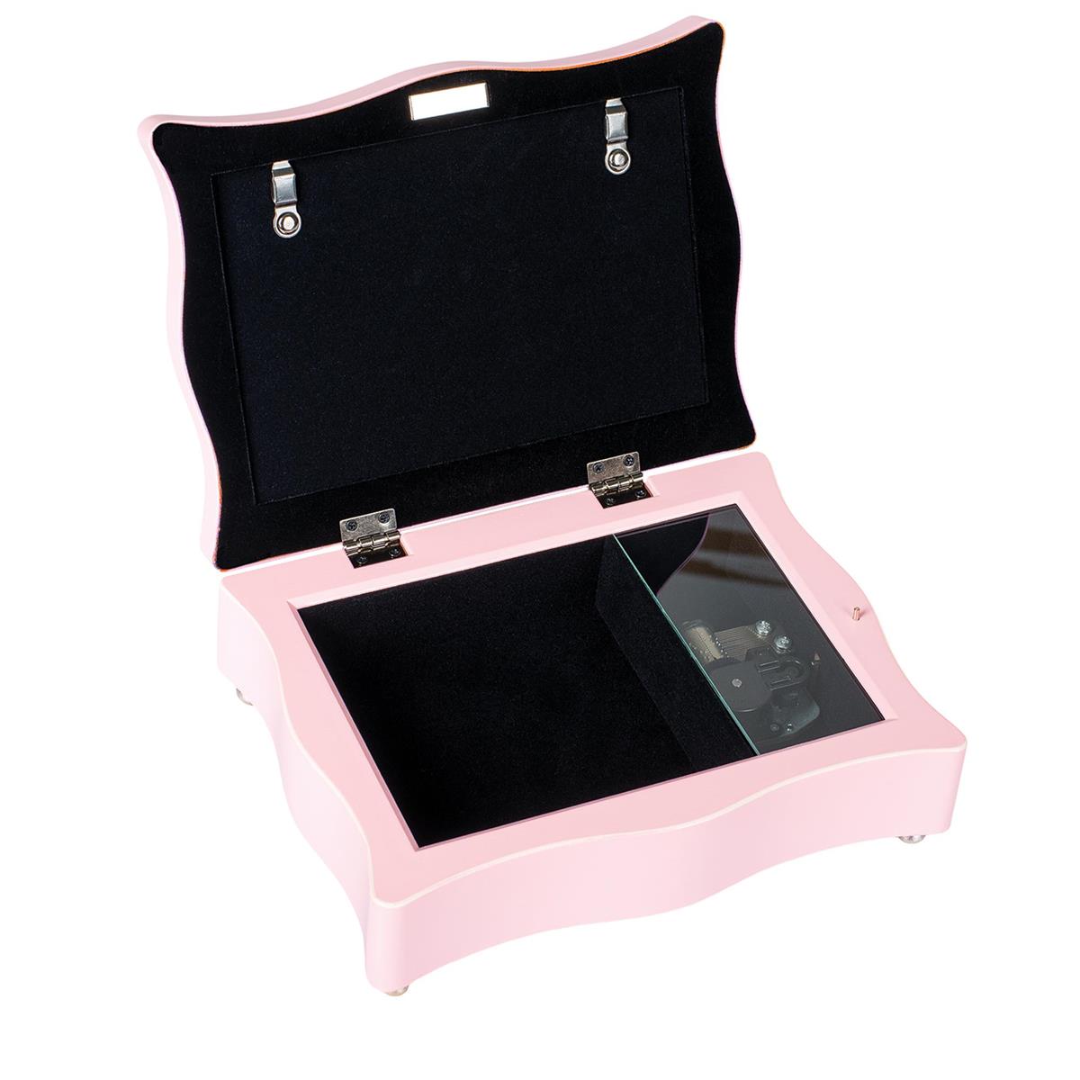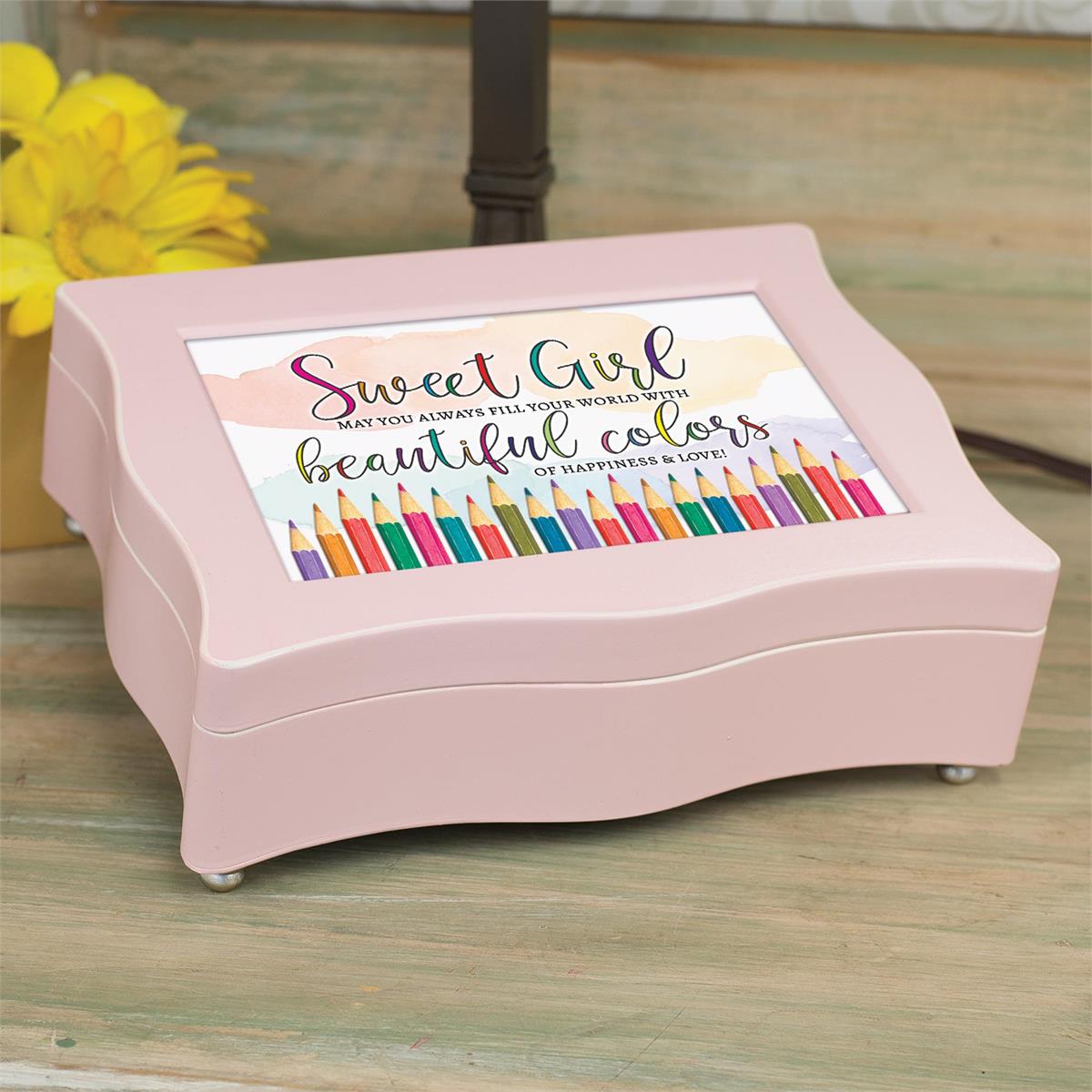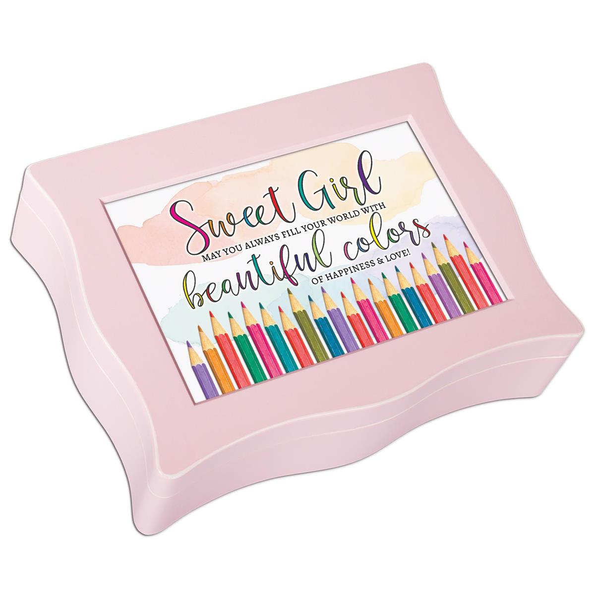 Sweet pink musical keepsake box features a fun and elegant wavy edge and a photo frame lid. Comes with colorful art print, under glass, that reads: Sweet girl/May you always fill your world with beautiful colors of happiness & love! Print can be changed out for a favorite 4x6 photo; the removable back under lid makes it easy. Inside box is a small compartment with clear glass top that shows the high quality Sankyo musical movement. When key under box is wound, music will play when lid is open and stop when it is closed. Plays the song: Brahms Lullaby. Storage compartment has a luxurious black velvety lining. Matching decorative legs on bottom are padded to protect furniture. Box is made of a super-sturdy polymer that resists cracking and chipping. Overall size is 8 x 6 x 2 3/4.
