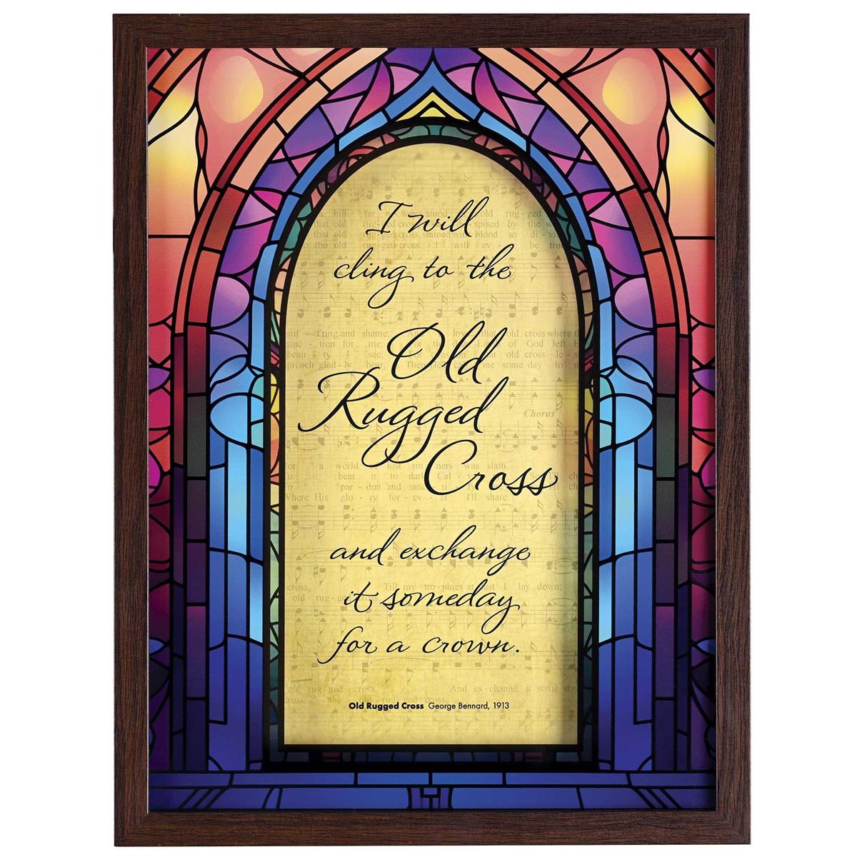 Shadow Box Style Framed Decor Features A Stained-Glass Design Around A Portion Of A Popular Hymn. Parts Of The Design Are Printed Directly On The Glass, While The Rest Are On An Insert, Giving The Piece A Dimensional Look. Frame Is MDF Wood With Walnut Finish. Print/Glass Size Is 12 X 16; Outer Frame Size Is 13 X 17 X 1-1/4. Hanger On Back. Assembled In The Us Of Imported Materials. Hymn: Old Rugged Cross By George Bennard, 1913. Artwork Copyright Cameron Gray. Comes Packed In A Brown Box.
