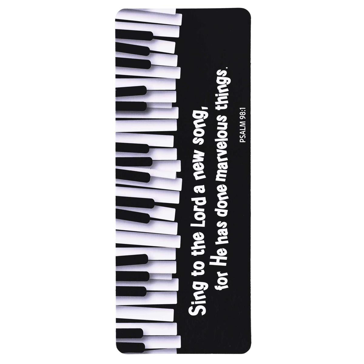 This Bookcard-Sized Bookmark Is 2-5/8 X 6-3/8; Card Stock Is Clear Laminated For Extra Durability. On The Front, This Bookmark Features A Piano Keyboard With Psalm 98:1: Sing To The Lord A New Song, For He Has Done Marvelous Things. The Back Side Has To And From Spaces For Personalization. Printed In USA. Comes Packed In A Polybag.