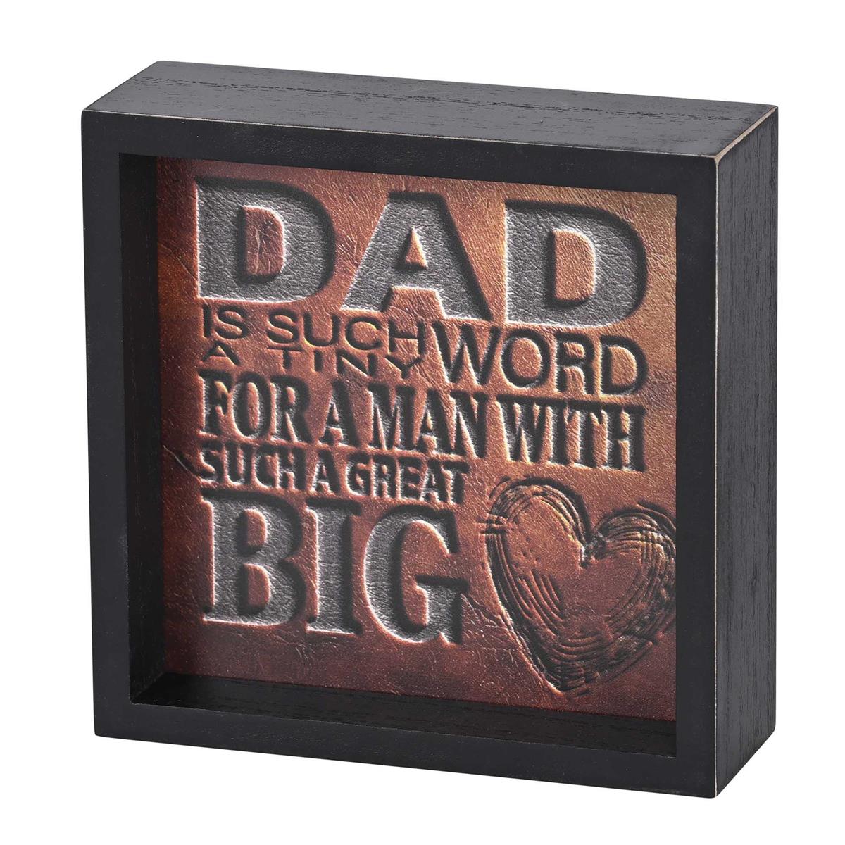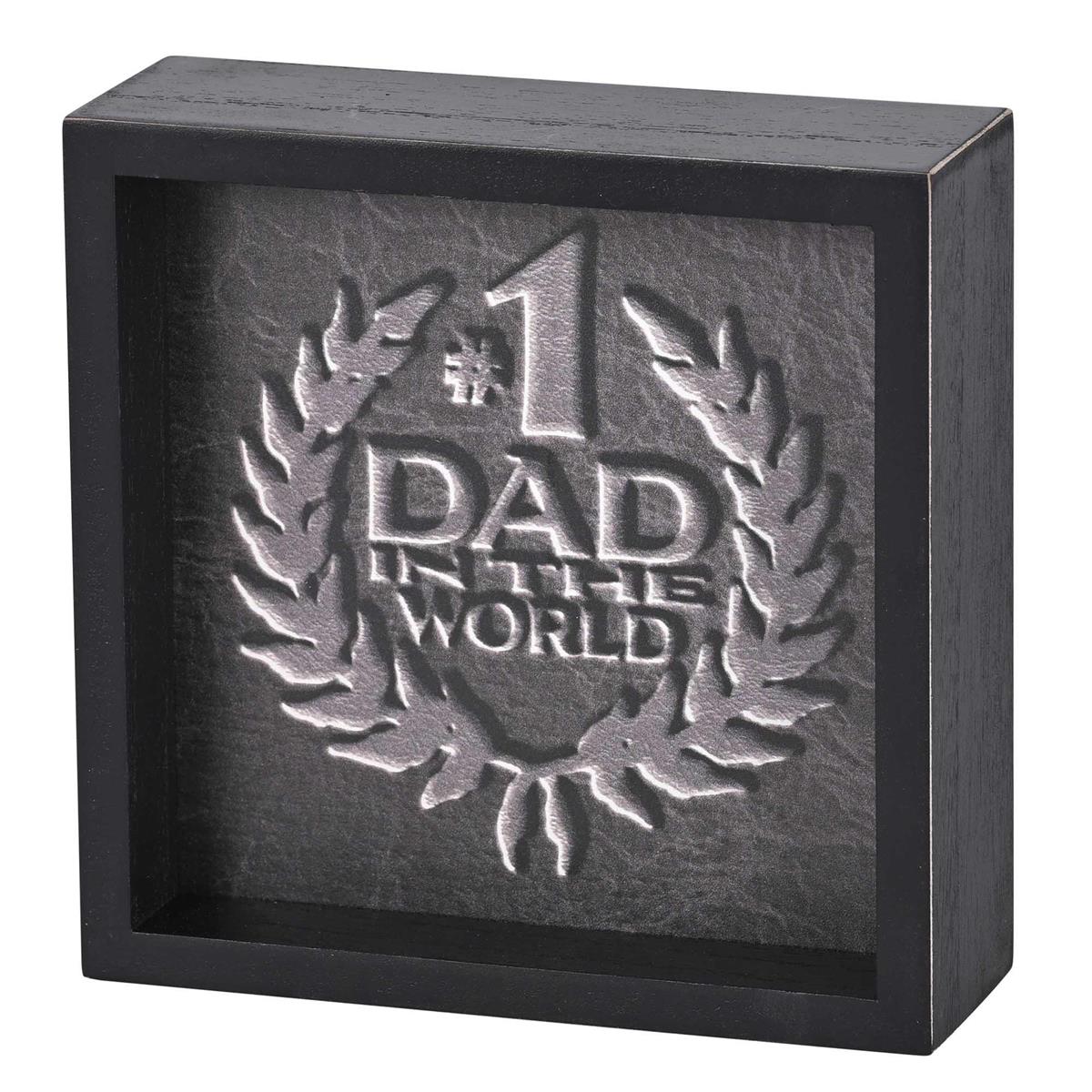 A Tabletop Art Piece Showcasing On One Side A Copper-Colored Background To Text: Dad Is Such A Tiny Word For A Man With Such A Great Big Heart. The Other Side Dark Features A Bold Background For A Crown And Text: Number 1 Dad In The World. Measures 6X6. Art Slides Out Of The Bottom And Can Be Interchanged. Black MDF-Wood Frame. Copyright Amylee Weeks Courtesy Of MHS Licensing. Comes Packed In A White Or Brown Box.