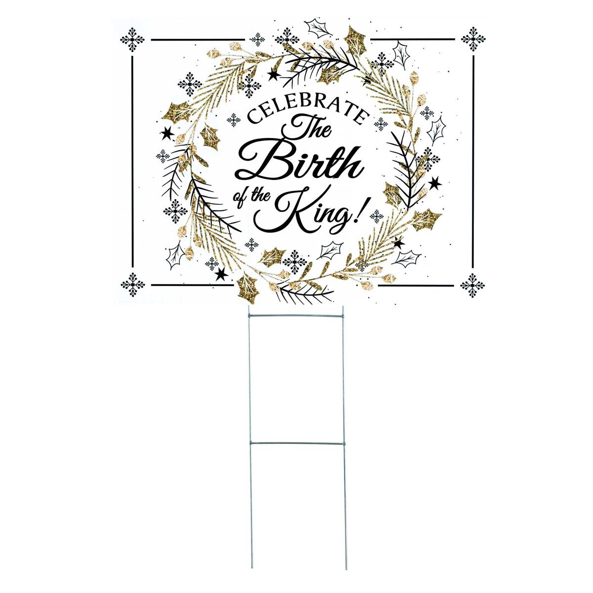 This Christmas Yard Sign Adds An Inspirational Touch To Your Outdoor Area While It Reminds All Who See It Of The True Meaning Of Christmas. Design Is Same On Both Sides. Sign Is 24W x 18H Durable, Weatherproof Coroplast. Comes With Metal Ground Stake That Inserts Easily Into Sign; No Tools Needed. Text: Celebrate The Birth Of The King!